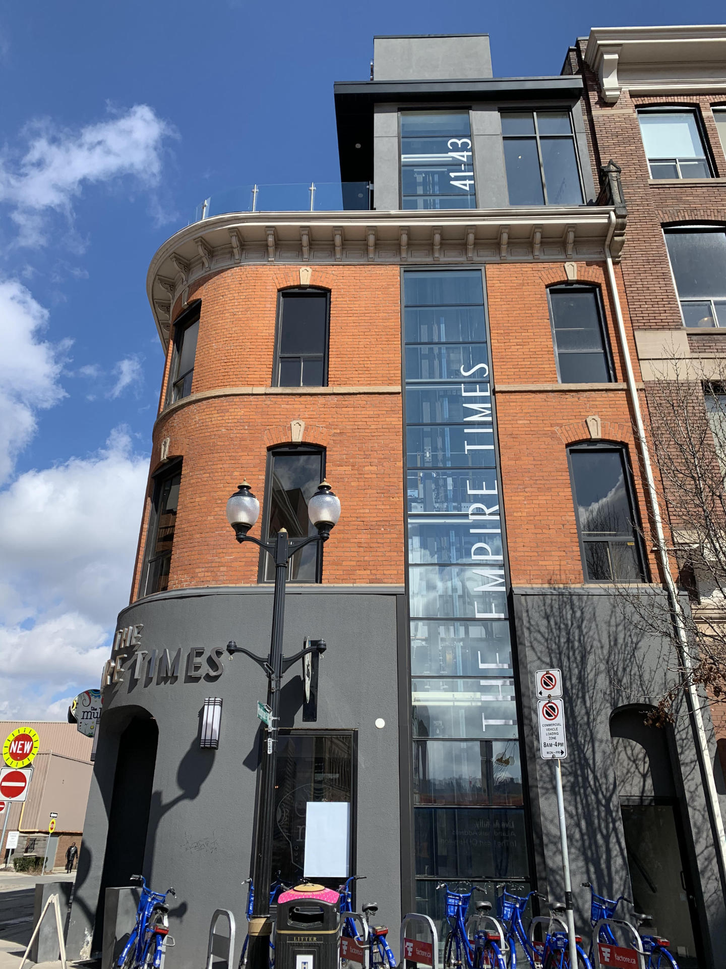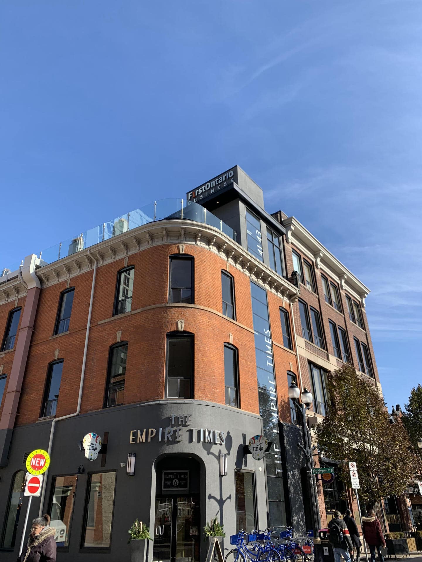 Located only one block from Gore Park, The Empire Times is a significant revitalization project in Hamilton’s central core. The project included the combination of two buildings, the addition of a glass-encased two-sided elevator servicing all floors, and the addition of a rooftop patio. Extensive interior renovations opened up large contemporary office spaces with exposed brick walls and ductwork. The Empire Times is home to home to The Diplomat, The Mule and Sagarmatha Curry Palace restaurants, a variety of creative businesses and studios, and FirstOntario Credit Union.